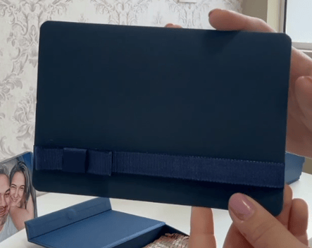 Um lindo cartão mensagem em papel especial selado com laço de Cetim para fechar o presente com chave de ouro.