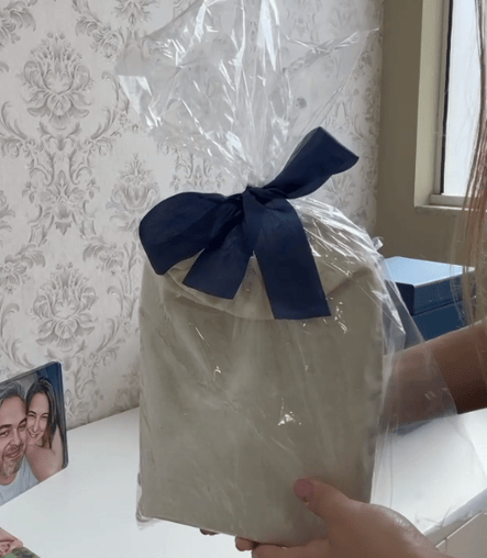 Toda caixinha vai envolvida dentro de uma sacola de algodão cru, junto a uma sacola de plástico fechado com um laço de cetin.